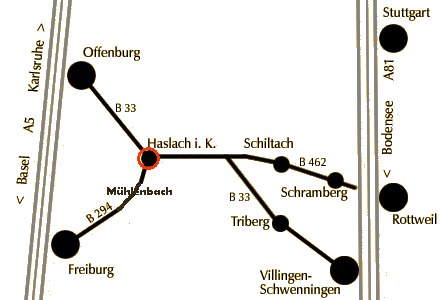 Auf der B33 bis Haslach, dann auf die B294 Richtung Freiburg abbiegen. Wenn Sie nun die 3. Straße links (Bergstraße) und dann die 3. Straße rechts abbiegen, dann sind sie bereits in der Dr. Kempf Straße.